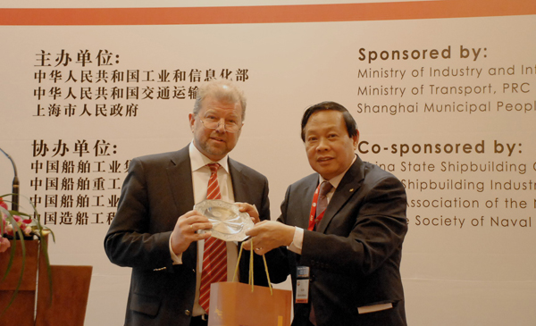 在高级海事论坛上会展组委会主席张圣坤向GL执行总裁赫尔曼·克莱因赠送纪念品